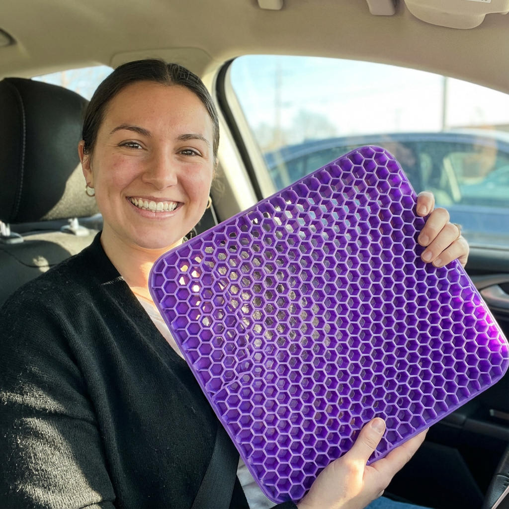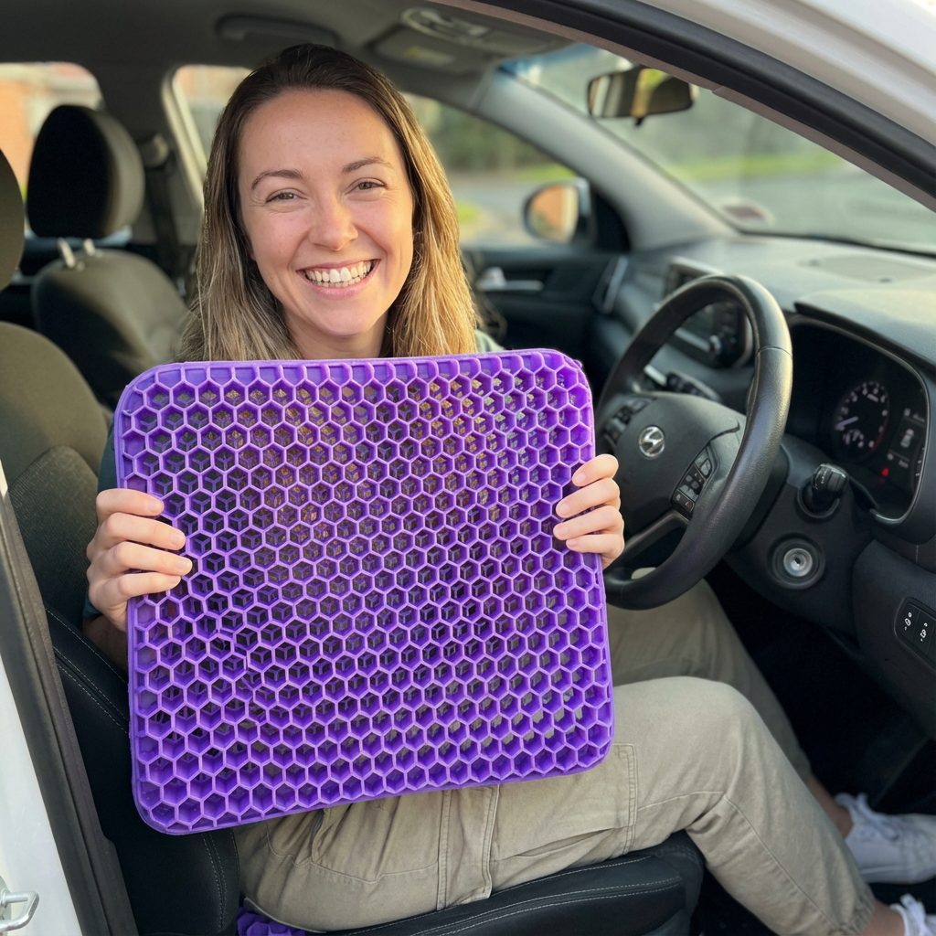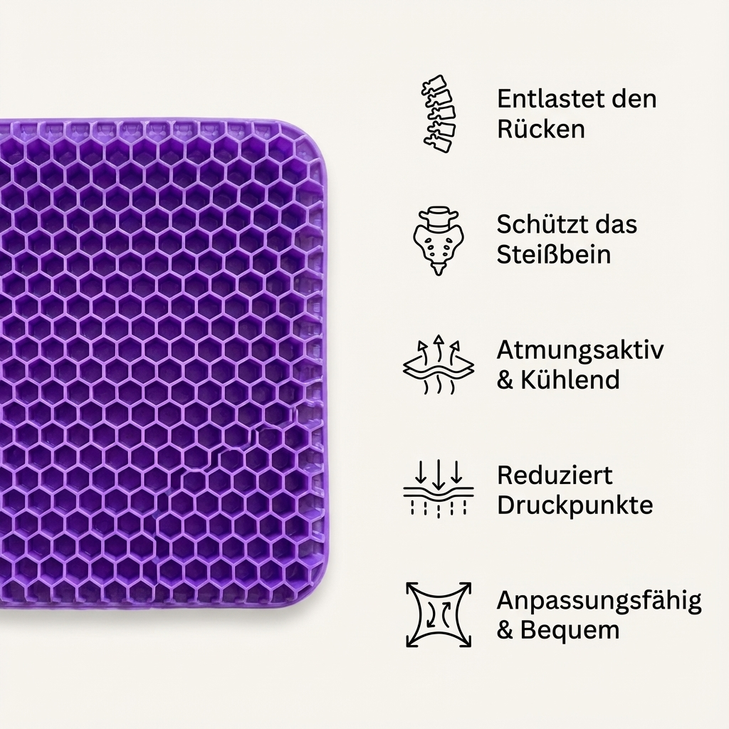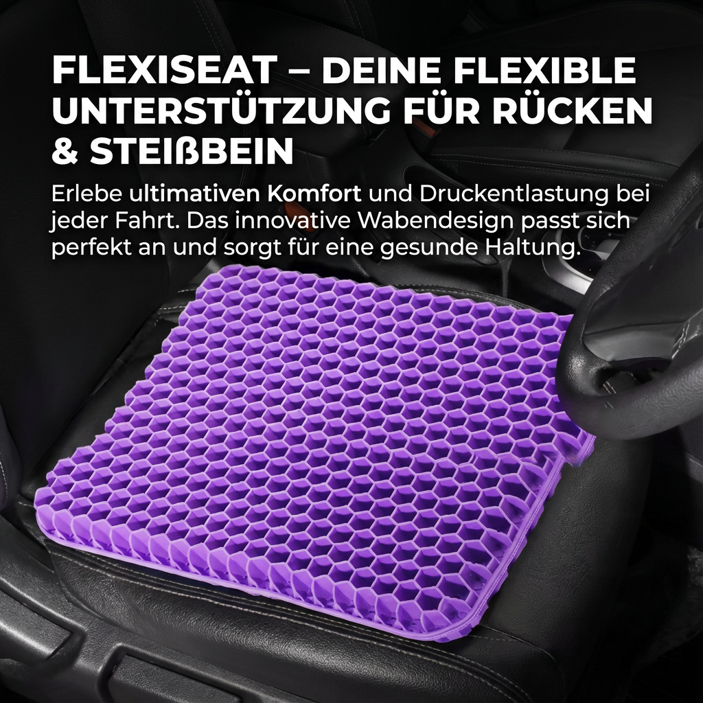 FlexiSeat – Dein entspanntes Sitzen ohne Schmerzen bietet die ideale Lösung. Das hochwertige Gel-Sitzkissen mit atmungsaktivem Wabendesign verteilt dein Körpergewicht gleichmäßig und reduziert gezielt den Druck auf Rücken und Steißbein. Gleichzeitig sorgt die offene Struktur für eine optimale Luftzirkulation – perfekt für warme Tage.