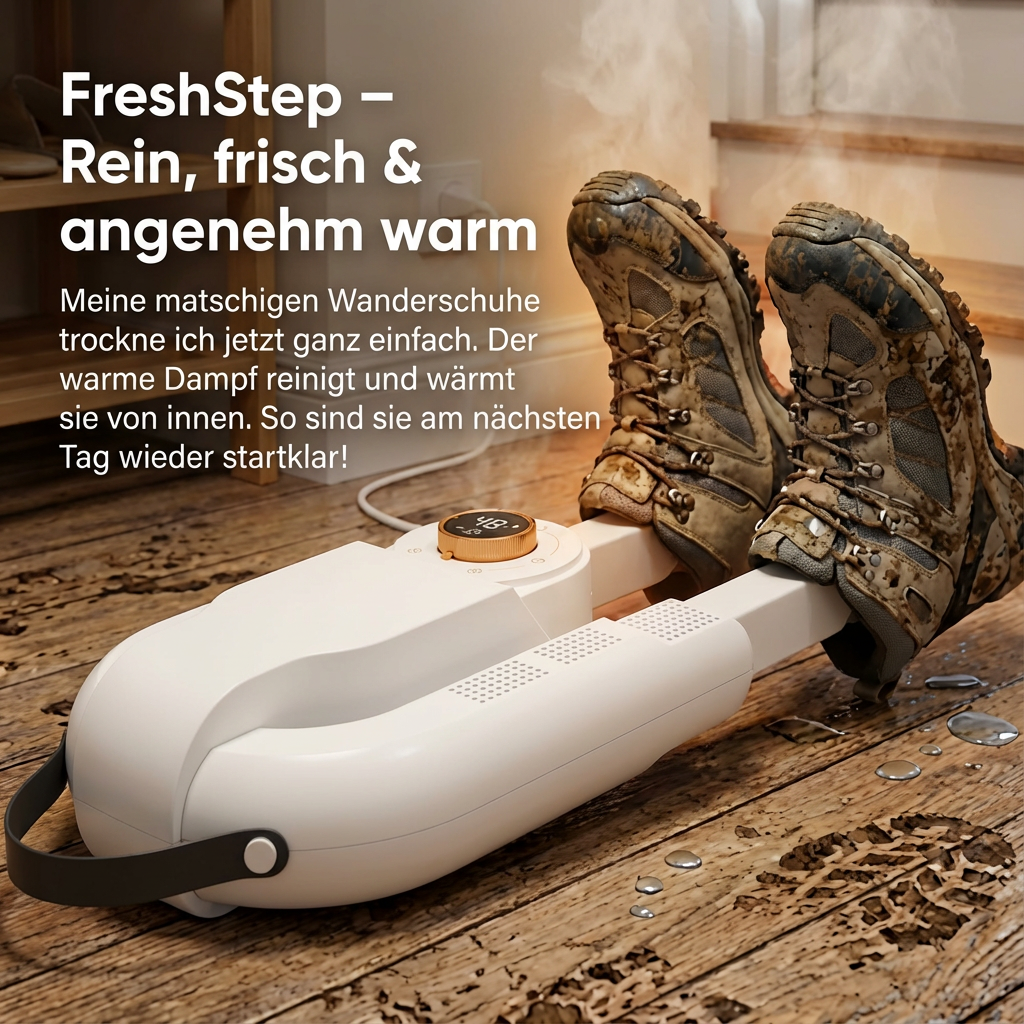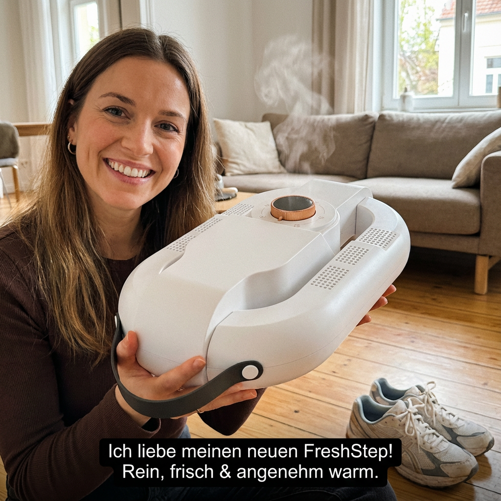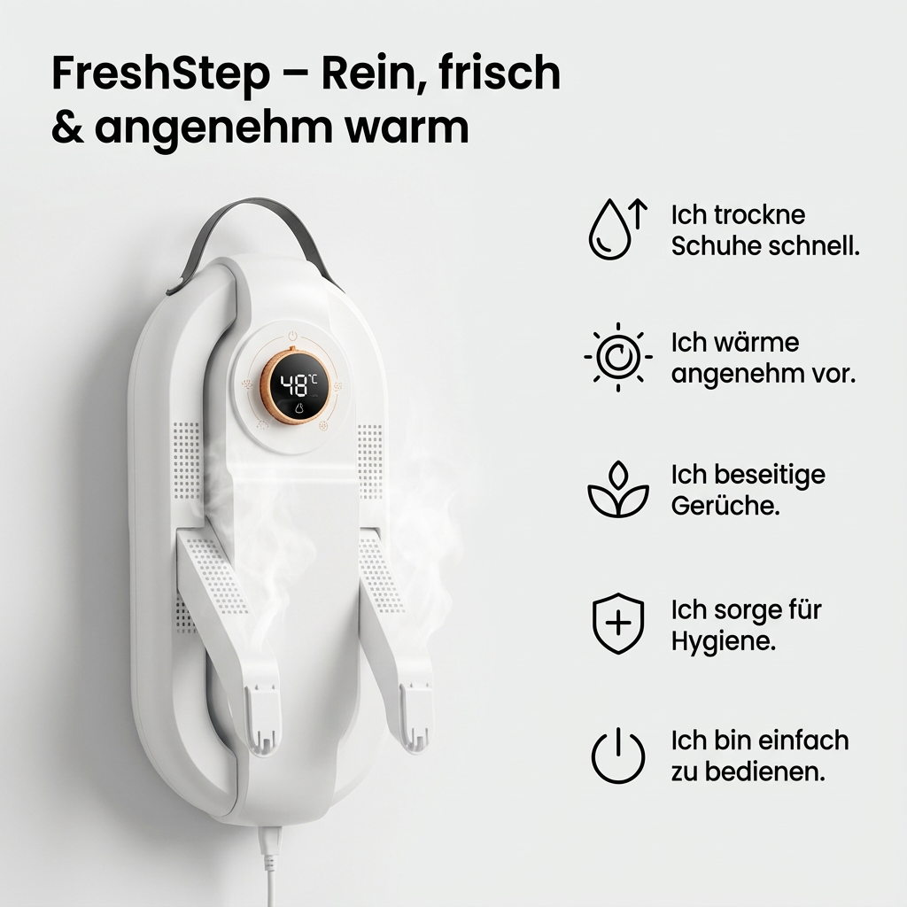 FreshStep ist ein elektrischer Schuhtrockner zum Trocknen und sanften Erwärmen von Schuhen. Das Gerät wird direkt in den Schuh eingesetzt und gibt gleichmäßig warme Luft ab, um Feuchtigkeit im Innenraum zu reduzieren.