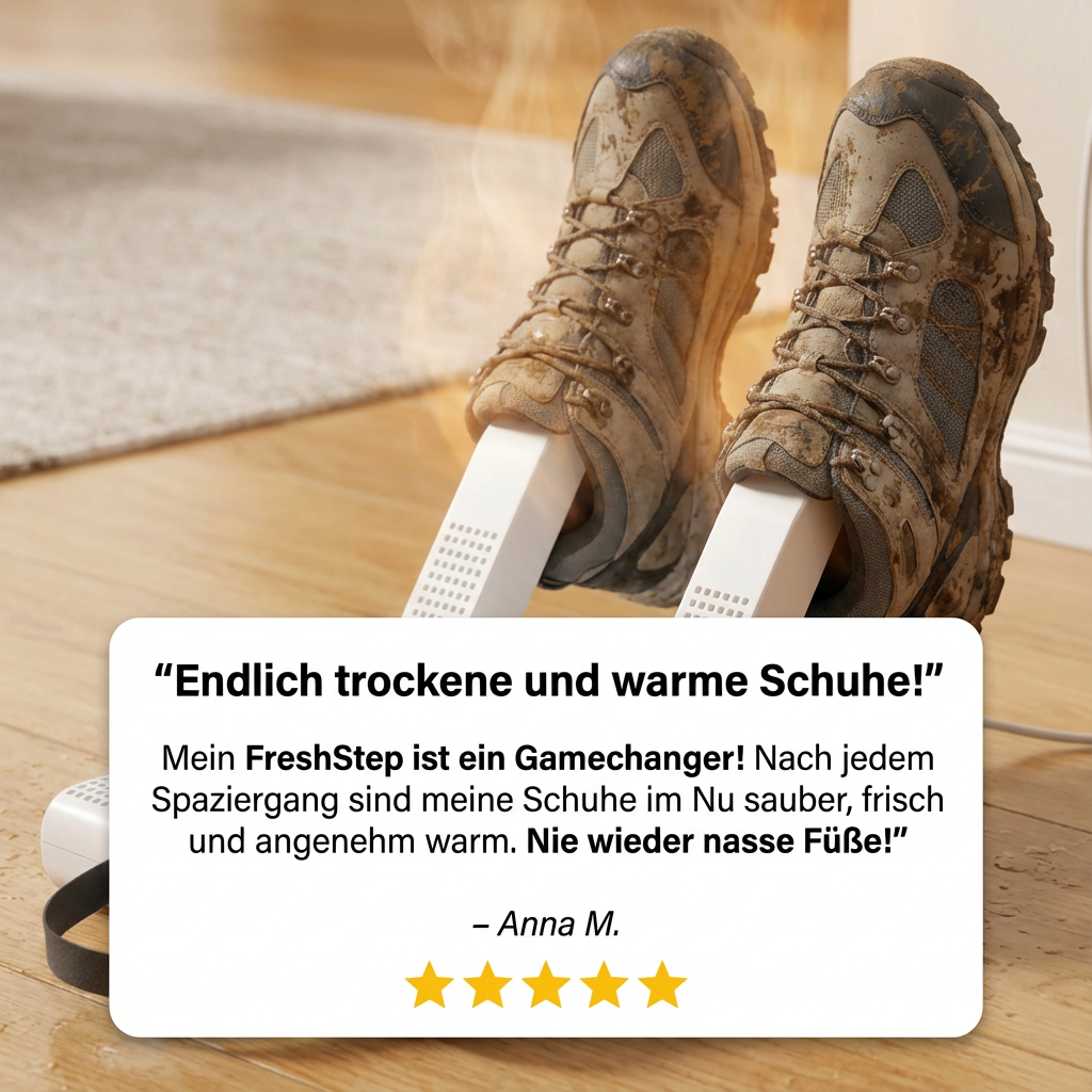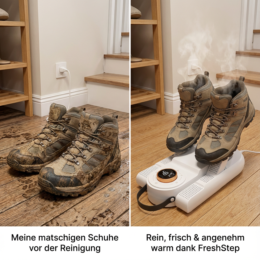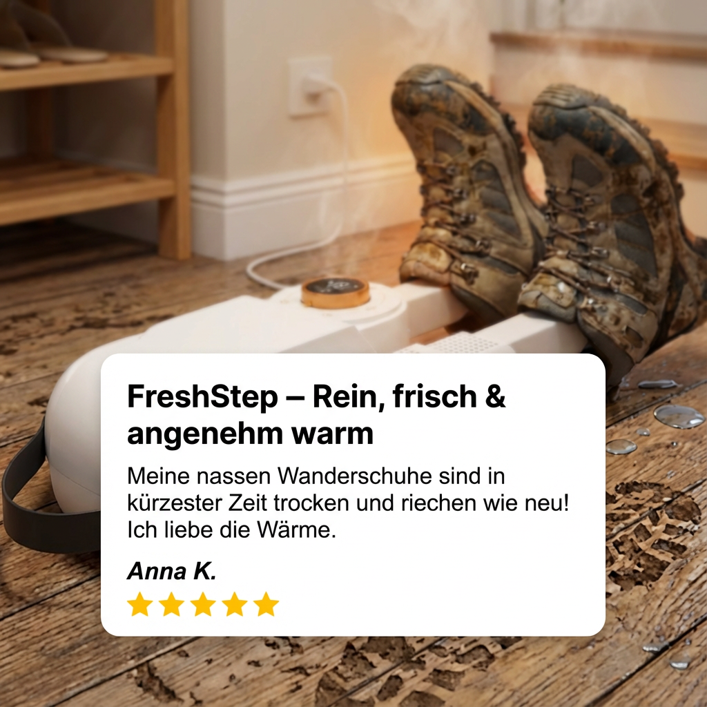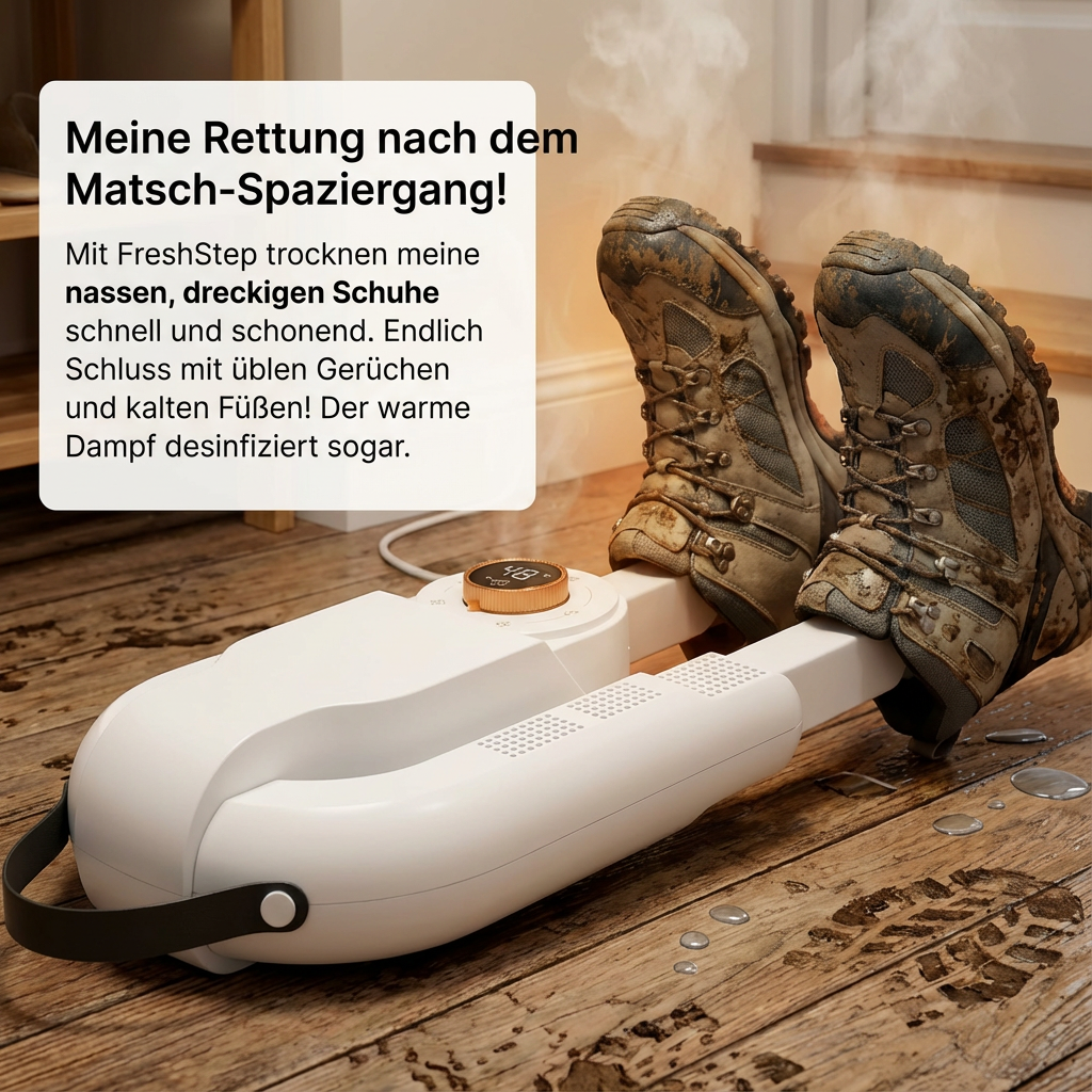 FreshStep ist ein elektrischer Schuhtrockner zum Trocknen und sanften Erwärmen von Schuhen. Das Gerät wird direkt in den Schuh eingesetzt und gibt gleichmäßig warme Luft ab, um Feuchtigkeit im Innenraum zu reduzieren.