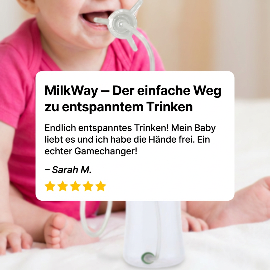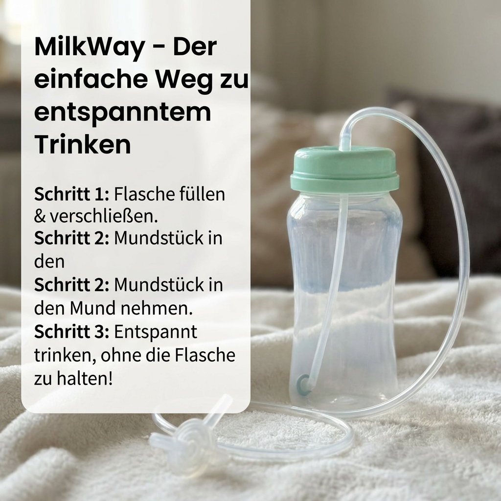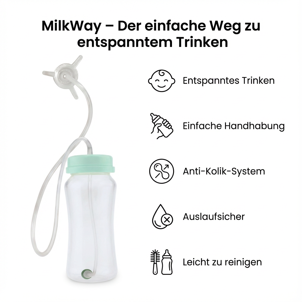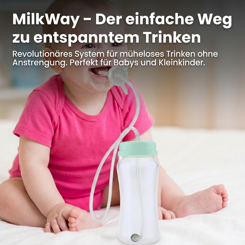 Mit Milkway wird das Trinken deines Babys endlich stressfrei – kein Chaos, kein Kleckern und kein Frust mehr bei jeder Mahlzeit. Die Flasche unterstützt dein Baby dabei, selbstständig und sicher zu trinken, egal ob im Liegen, Sitzen oder unterwegs. Der flexible Mini-Schlauch passt sich jeder Bewegung an und sorgt für einen sanften, gleichmäßigen Trinkfluss, sodass Babys nicht zu viel oder zu wenig trinken. Du musst dich nicht mehr um verschüttetes Wasser oder Milch sorgen, und dein Baby bleibt ruhig und zufrieden. So wird jede Mahlzeit zu einem entspannten Moment für Kind und Eltern, während das Lernen des selbstständigen Trinkens spielerisch unterstützt wird.
