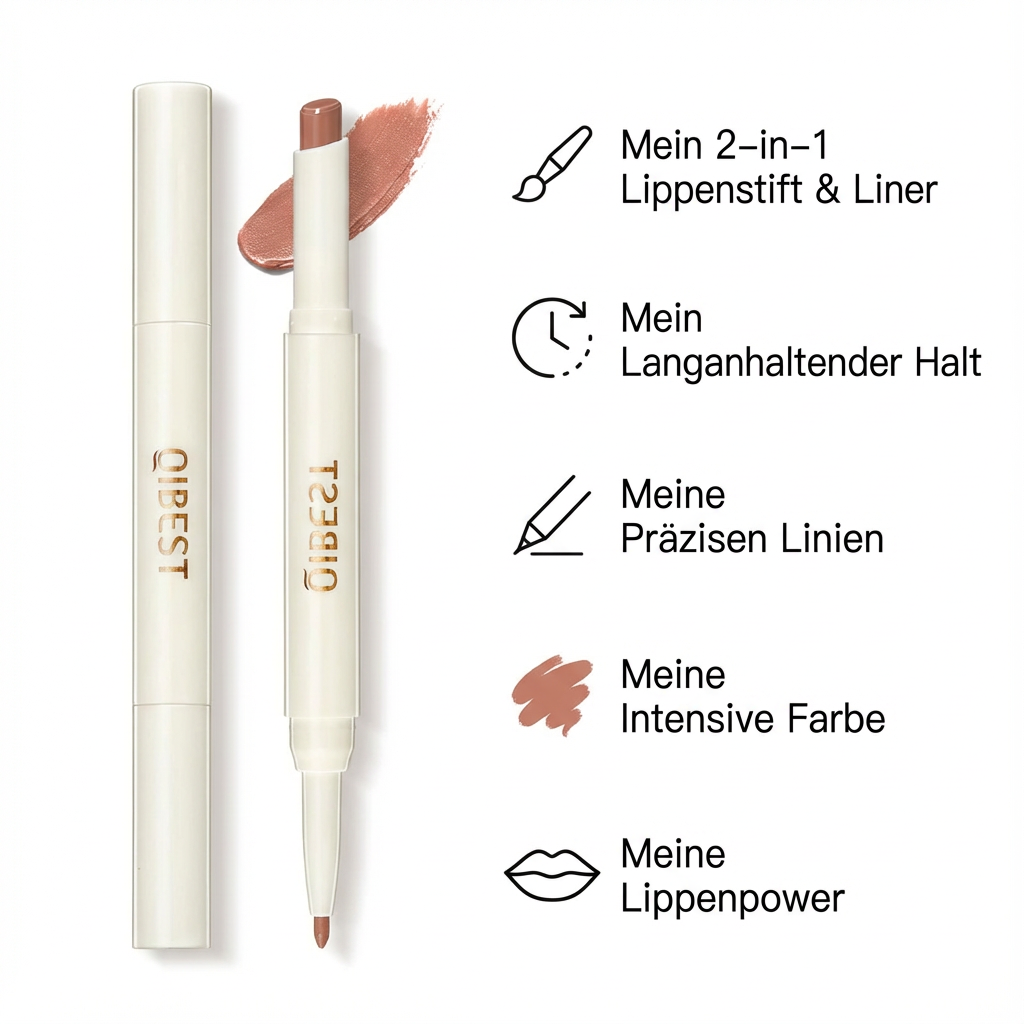 Der 2-in-1 mattierte Lippenstift mit integriertem wasserdichtem Lipliner vereint intensive Farbe, präzise Definition und langanhaltenden Tragekomfort in nur einem Produkt. Die cremige Textur gleitet sanft über die Lippen, trocknet matt und bleibt zuverlässig dort, wo sie soll – ohne Verschmieren.